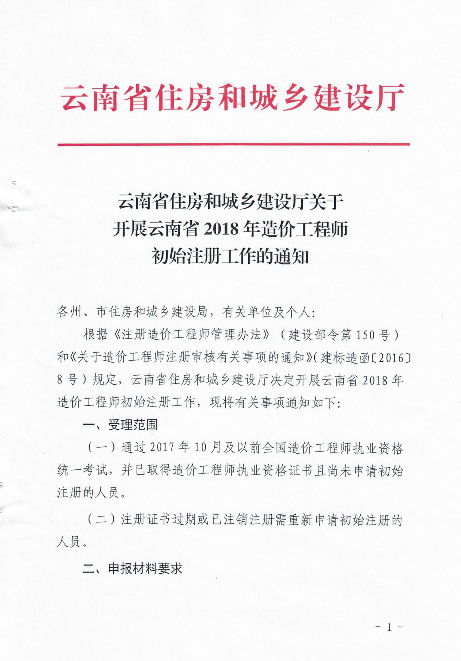 云南省住房和城乡建设厅关于开展云南省2018年造价工程师初始注册工作的通知