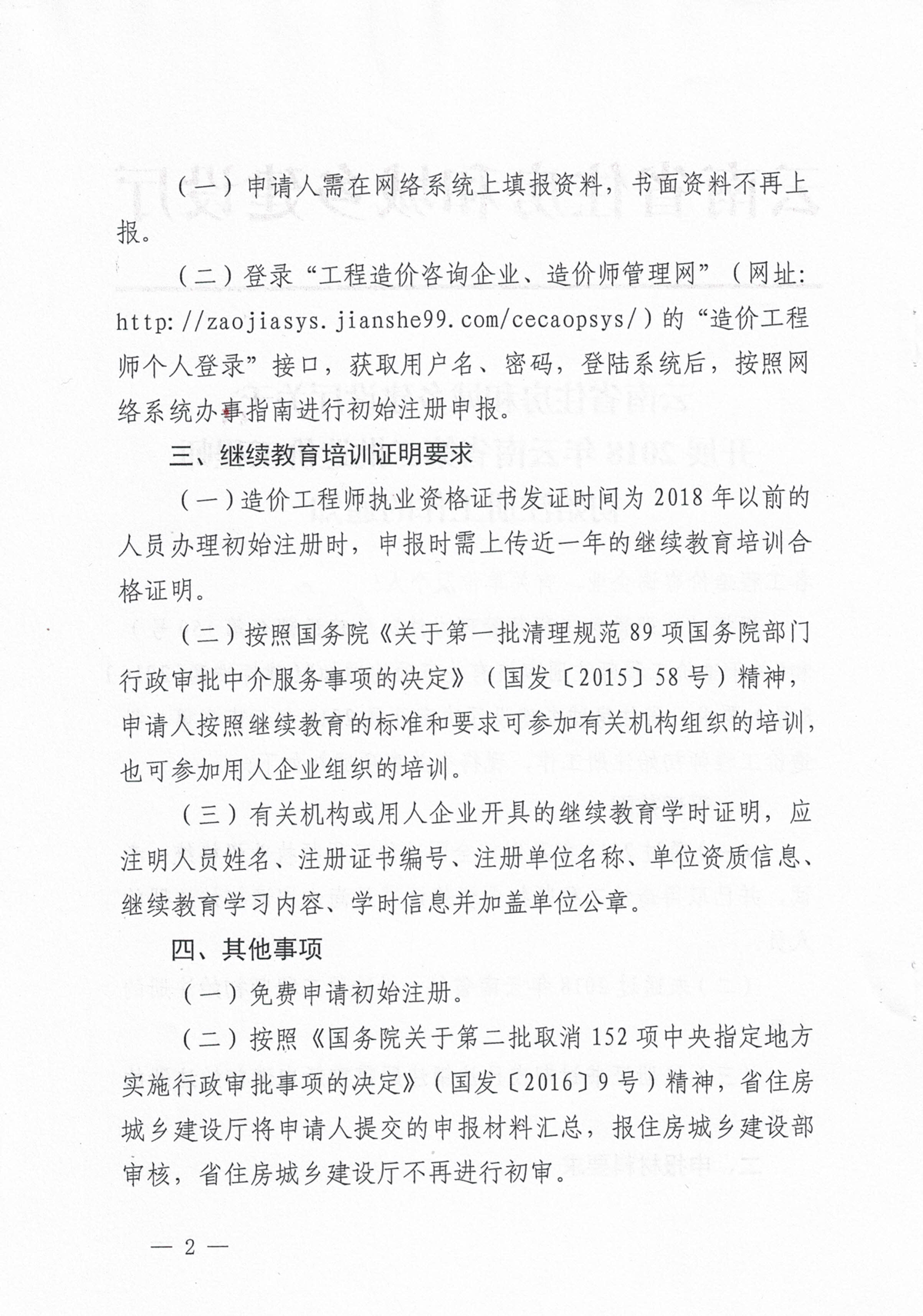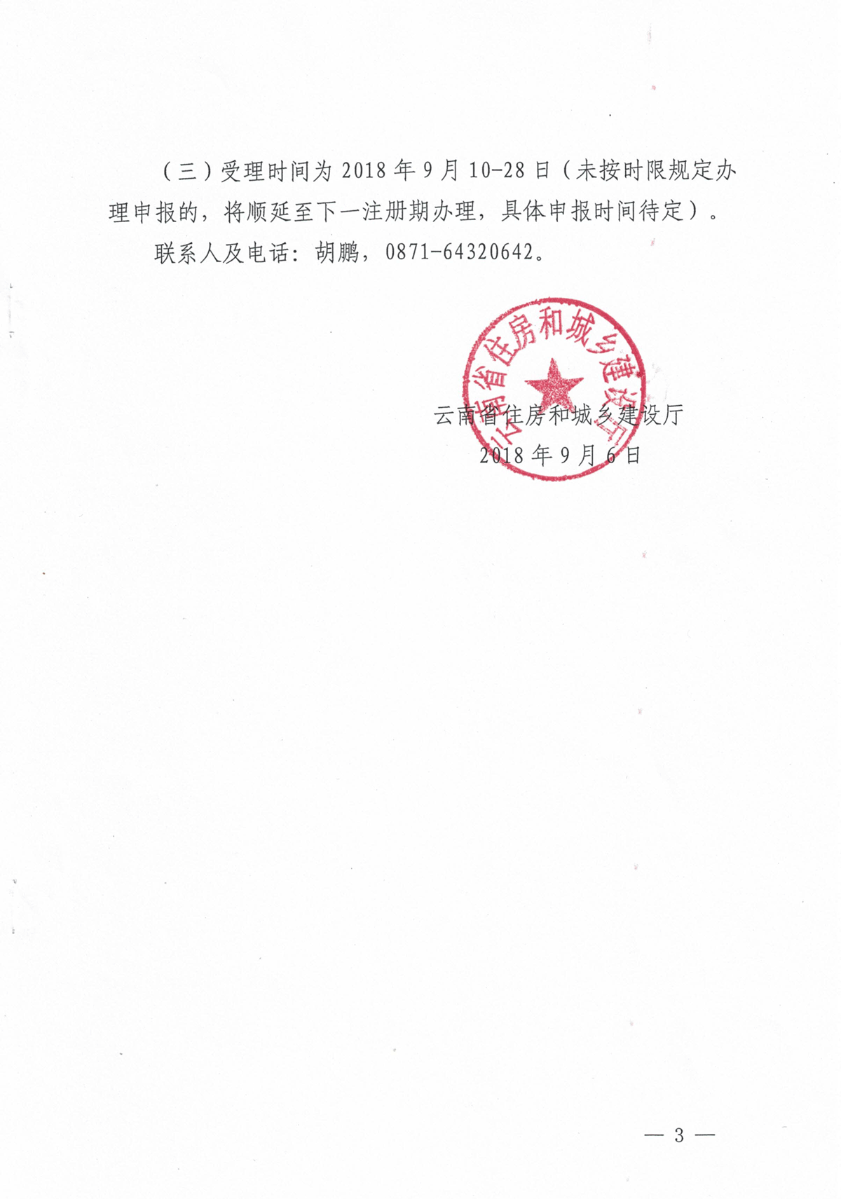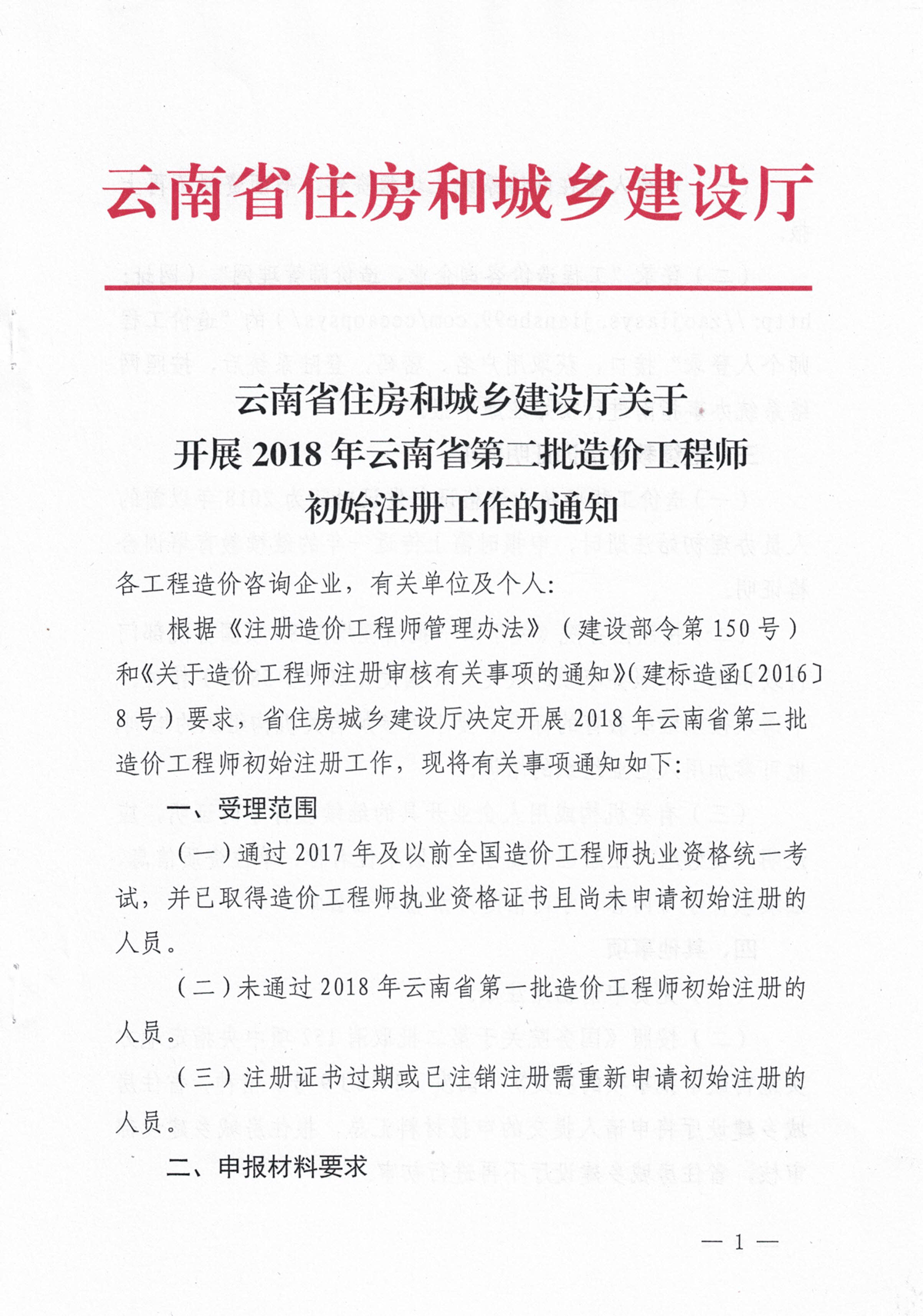 云南省住房和城乡建设厅关于开展2018年云南省第二批造价工程师初始注册工作的通知