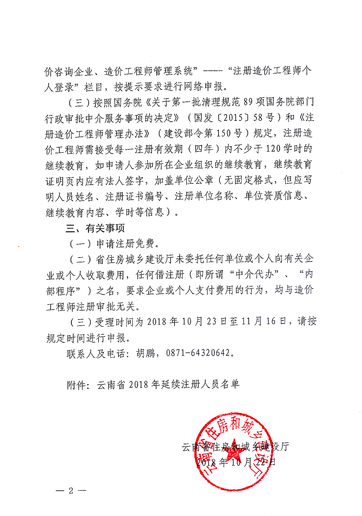 云南省住房和城乡建设厅关于开展云南省2018年造价工程师延续注册工作的通知