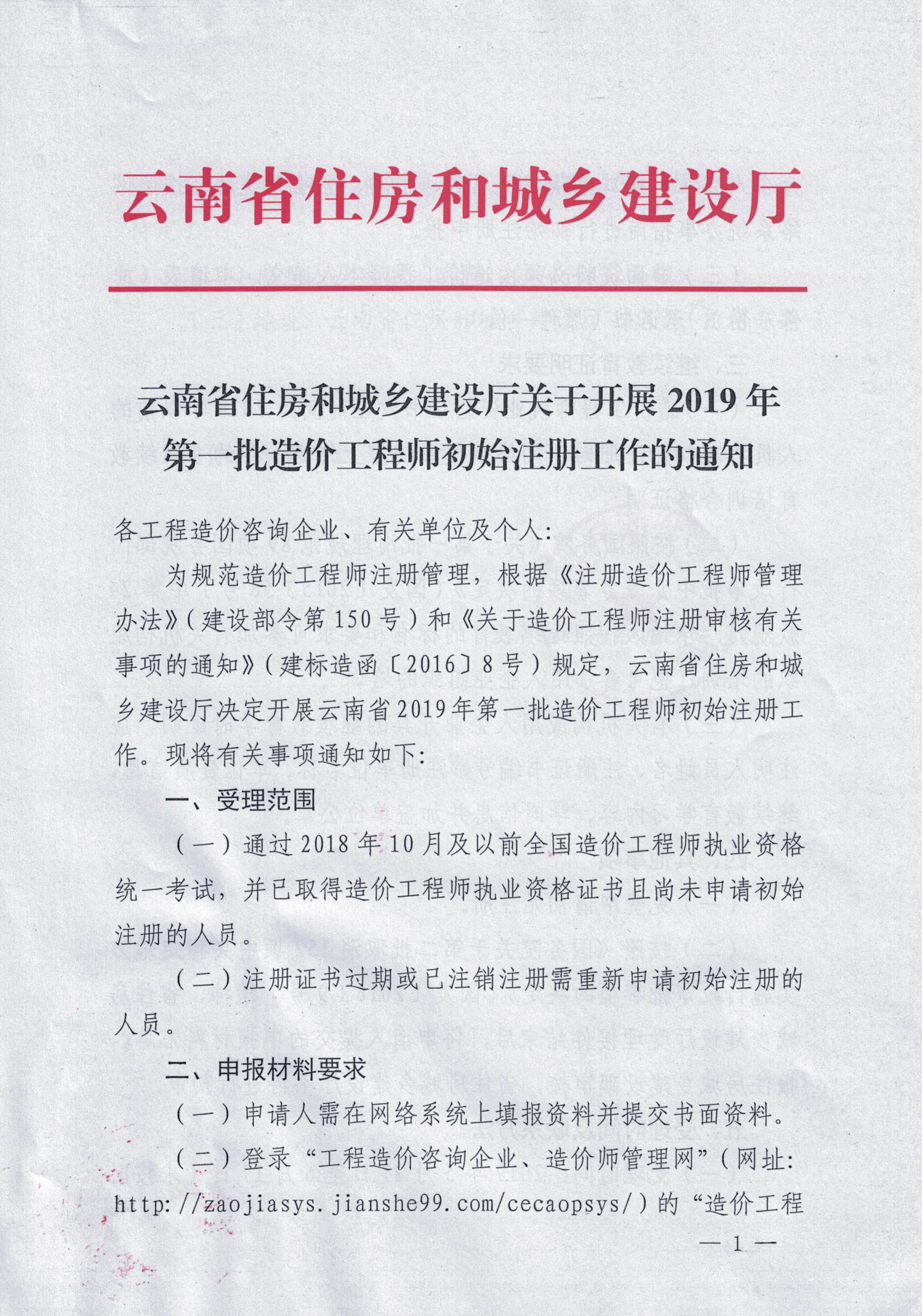 云南省住房和城乡建设厅关于开展2019年第一批造价工程师初始注册工作的通知