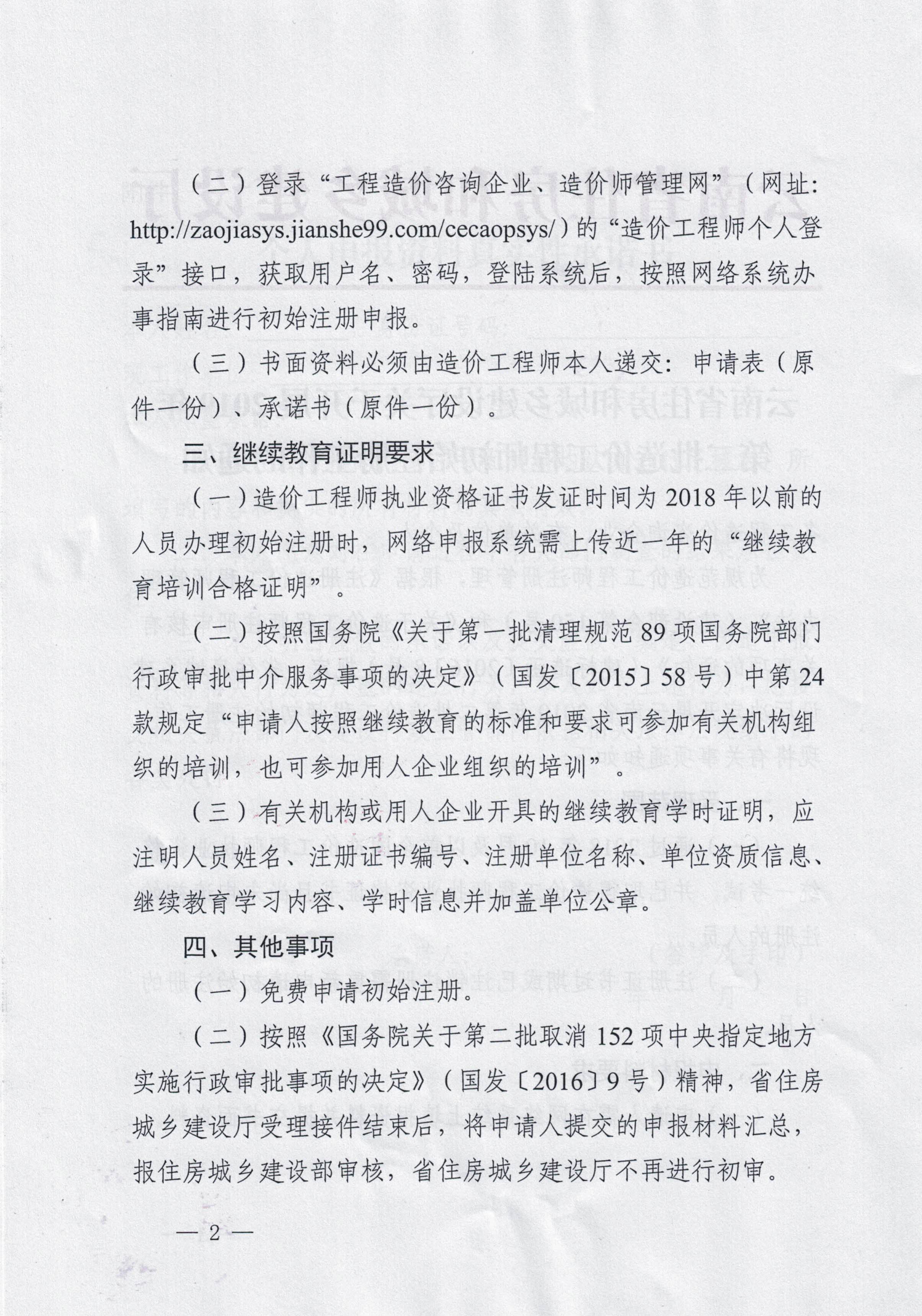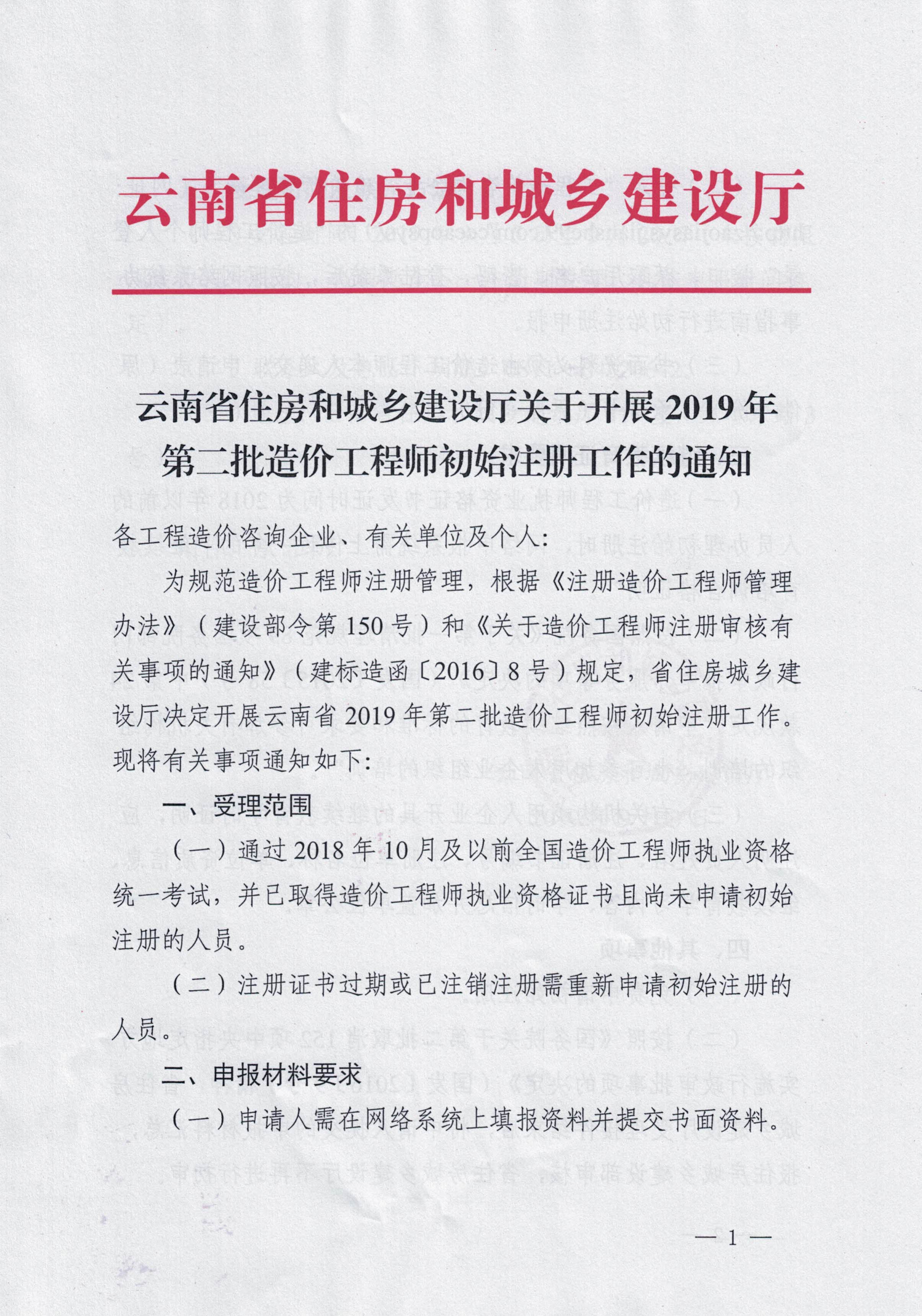云南省住房和城乡建设厅关于开展2019年第二批造价工程师初始注册工作的通知