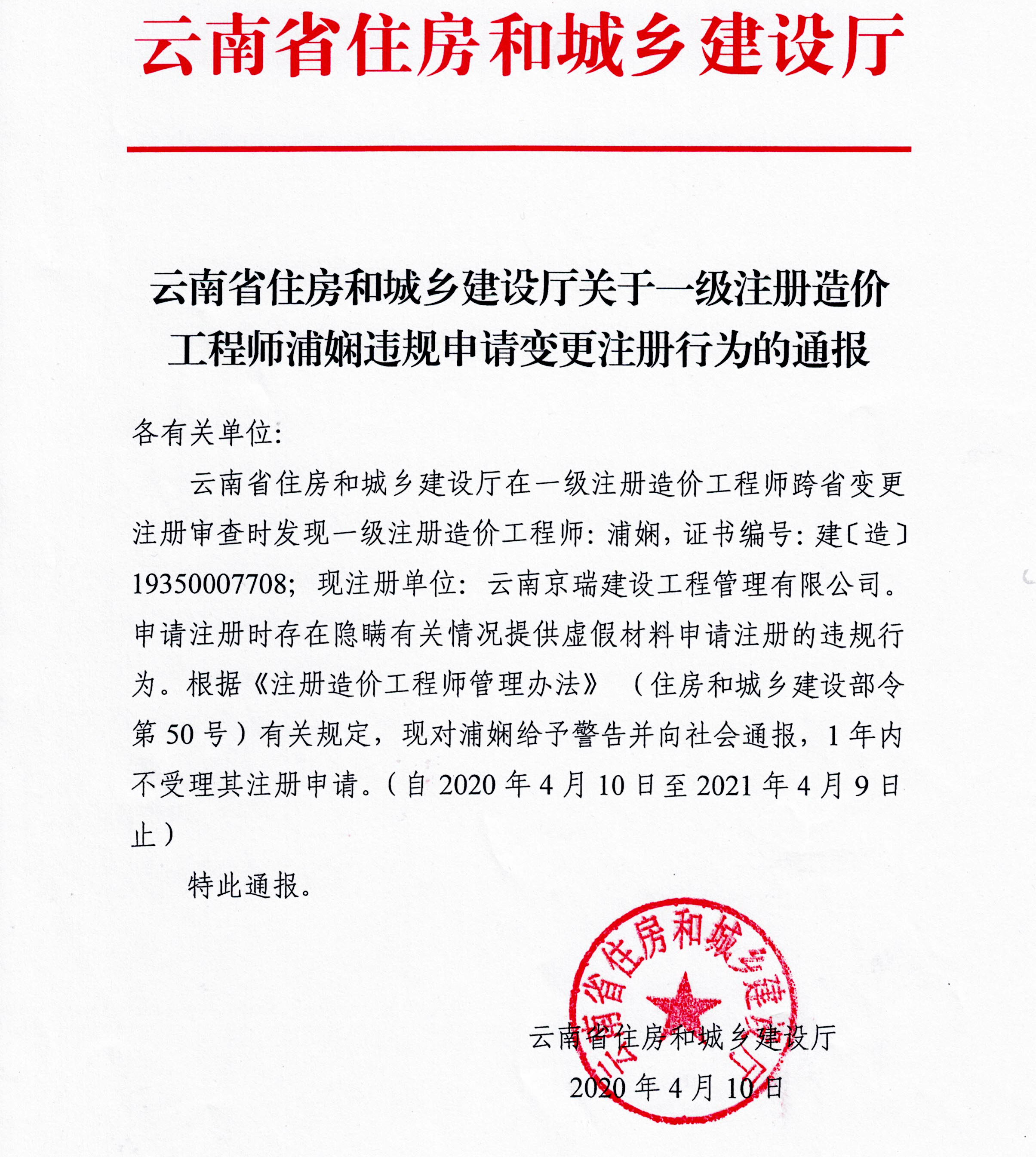 云南省住房和城乡建设厅关于一级注册造价工程师浦娴违规申请变更注册行为的通报