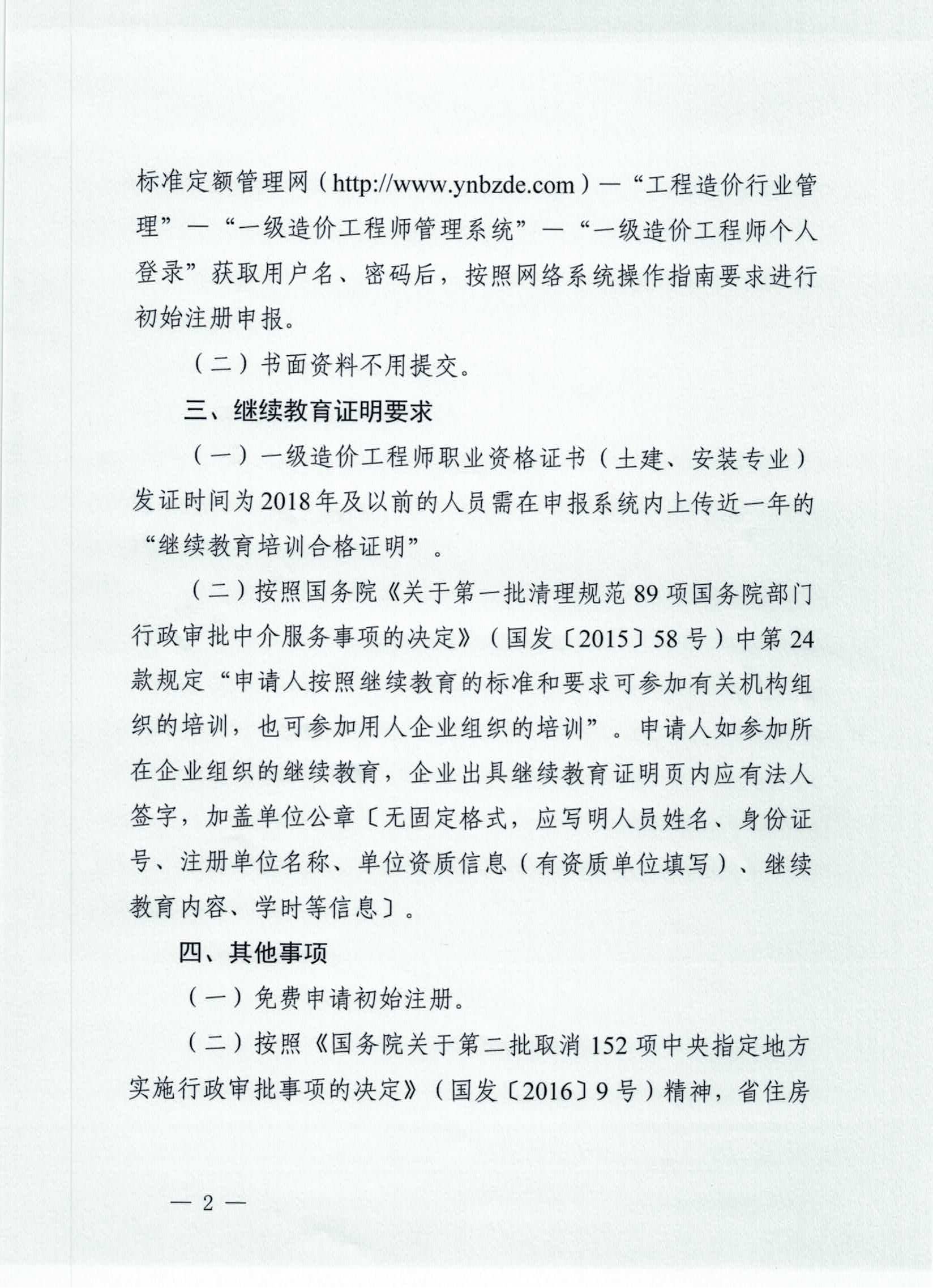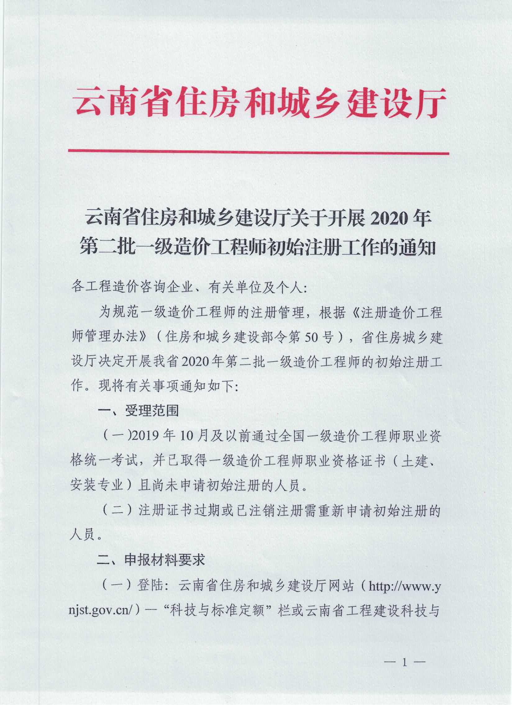 云南省住房和城乡建设厅关于开展2020年第二批一级造价工程师初始注册工作的通知