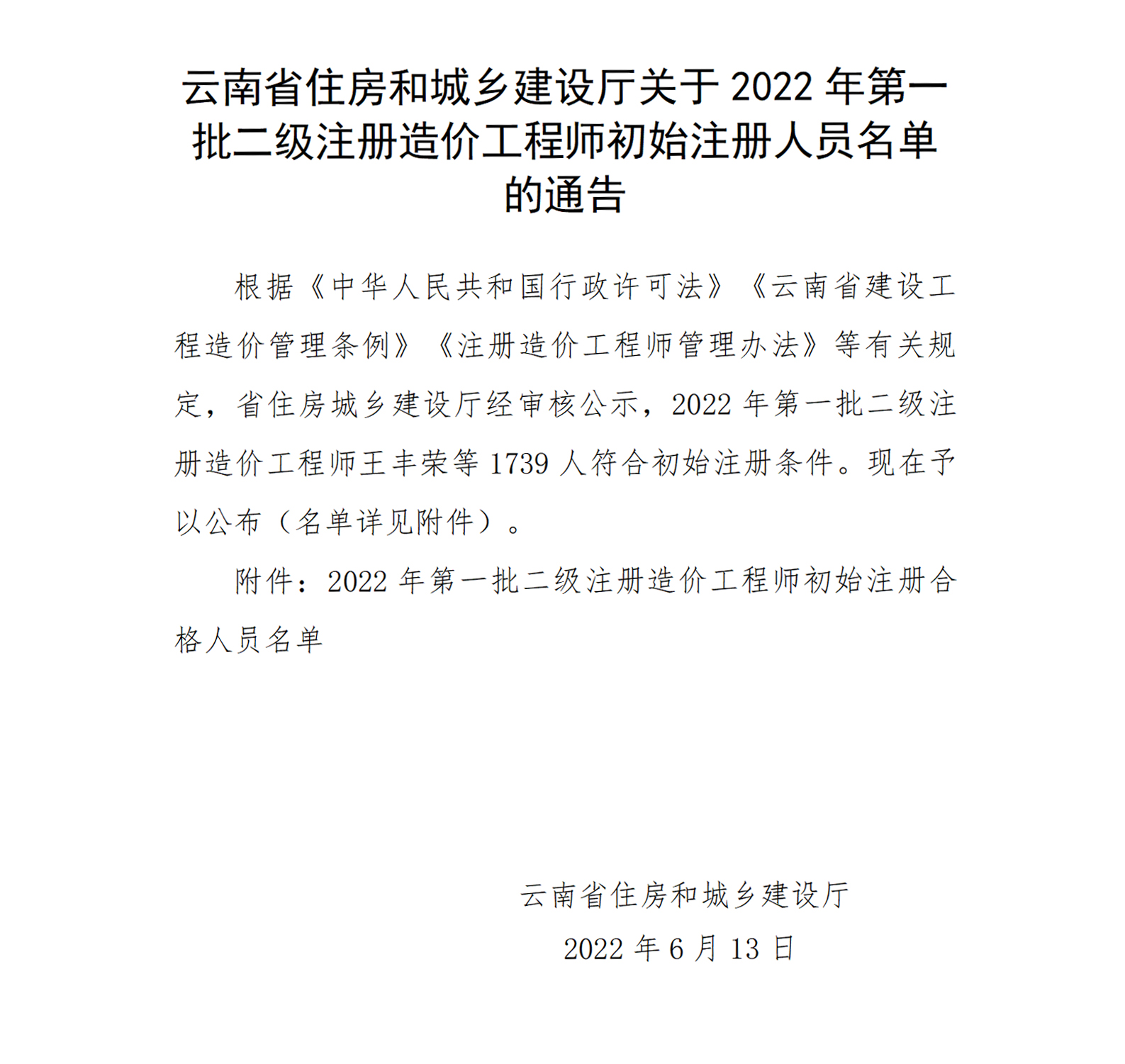 云南省住房和城乡建设厅关于2022年第一批二级注册造价工程师初始注册人员名单的通告