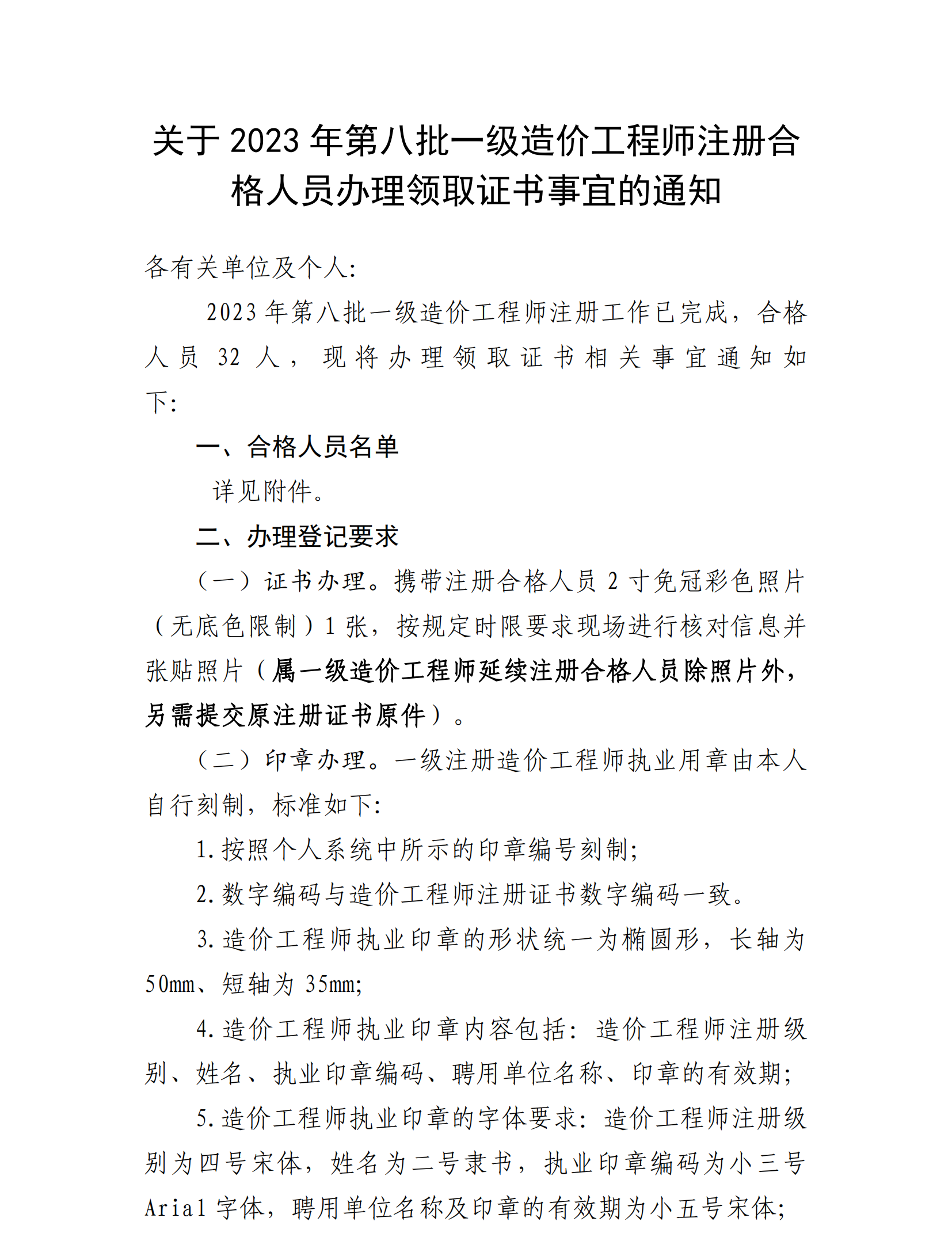 关于2023年第八批一级造价工程师注册合格人员办理领取证书事宜的通知