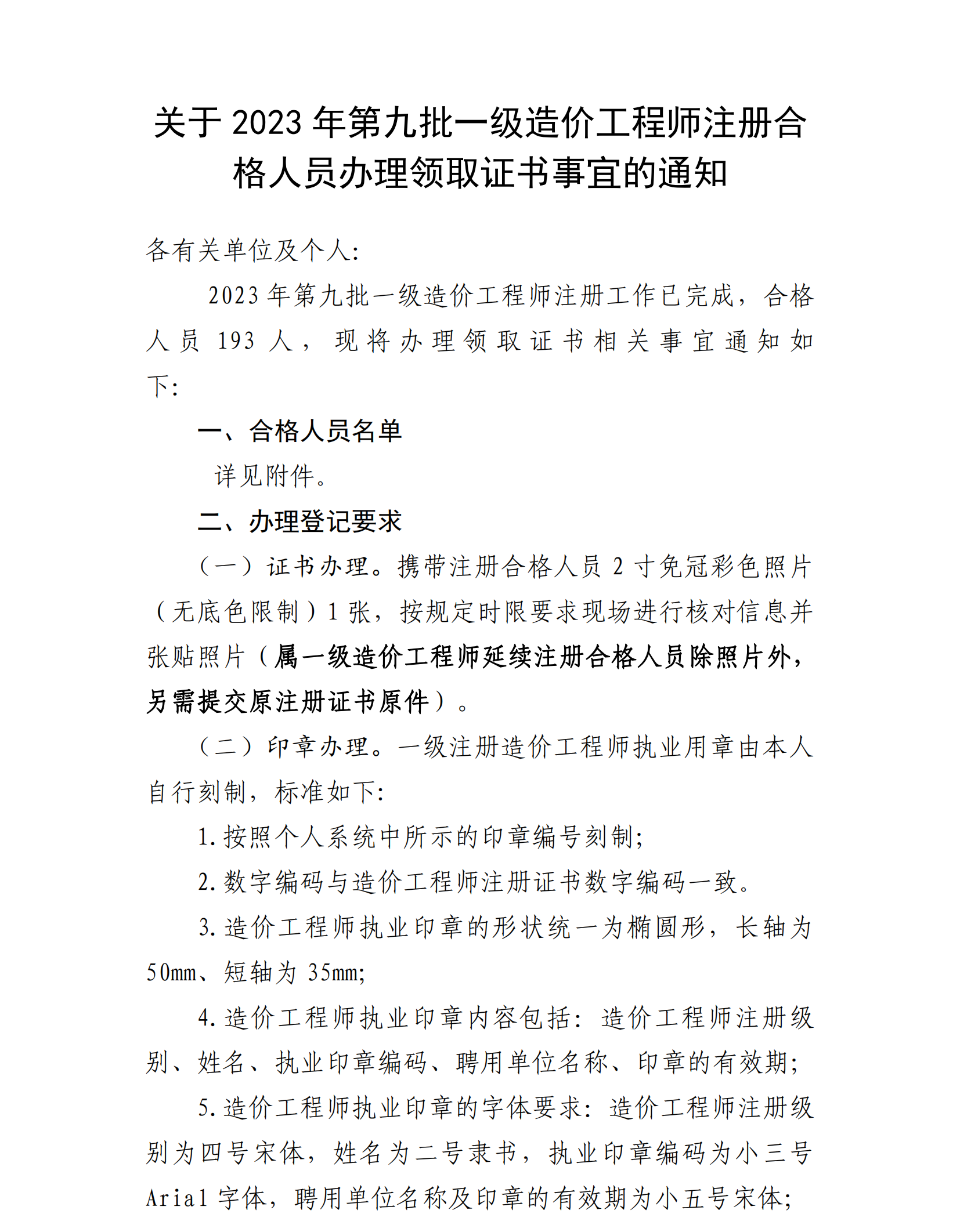 关于2023年第九批一级造价工程师注册合格人员办理领取证书事宜的通知
