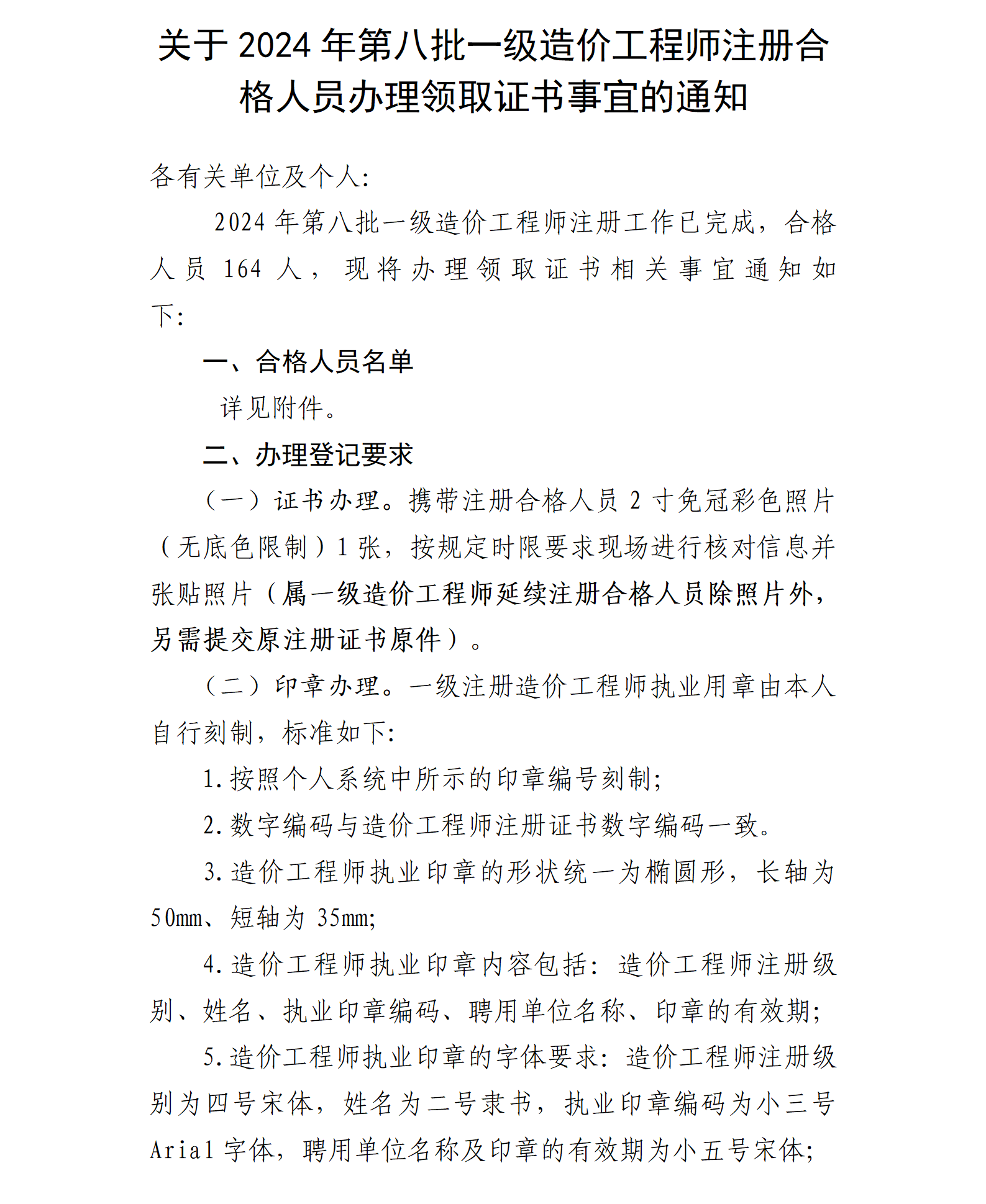 关于2024年第八批一级造价工程师注册合格人员办理领取证书事宜的通知
