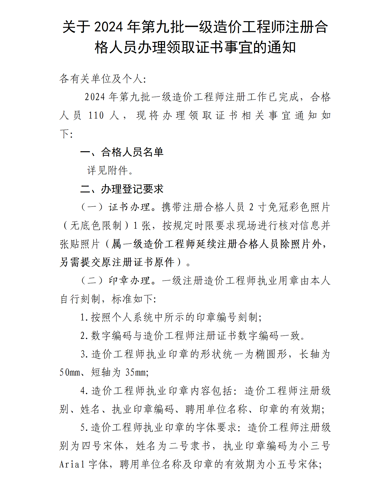 关于2024年第九批一级造价工程师注册合格人员办理领取证书事宜的通知